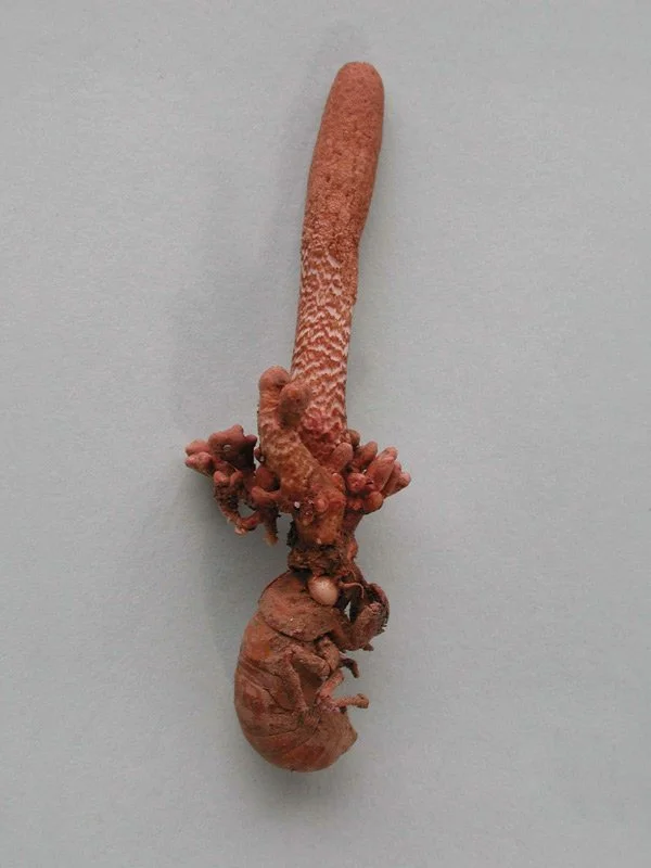 I started hunting these fungi, or mushikusa as I prefer to call them to keep things simple, about seventeen or eighteen years ago. Back then, you could find O. sobolifera fairly easily around the local temples and shrines near my studio, especially during the rainy season. Sometimes ten or even twenty would appear at once. I used to dig them up and soak them in liquor to make cicada fungus sake, or harden them in varnish to use as materials in my work. It felt like a perfectly ordinary species. But about ten years ago, their numbers began to decline. Now, it has become rare to find even one.