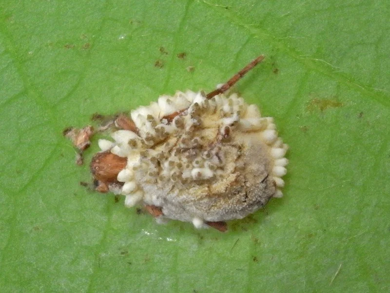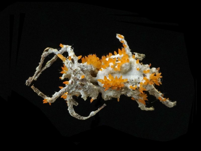 The best-known group of Cordyceps fungi is the genus Cordyceps itself. These fungi produce elongated fruiting bodies from insect hosts and form perithecia at the tips. Famous species like Ophiocordyceps sobolifera and Cordyceps militaris belong to this group. In contrast, the genus Torrubiella forms its fruiting structures directly on the surface of the host without a distinct stalk. Many species in this genus parasitize spiders, ants, or planthoppers, and most are aerial species that attach to leaf undersides or branch surfaces. Since their hosts are not buried underground, they have no need to develop long fruiting stalks. Though they lack prominent fruiting bodies, the neat arrangement of their perithecia can resemble tiny flowers, and their colors vary beautifully from species to species.