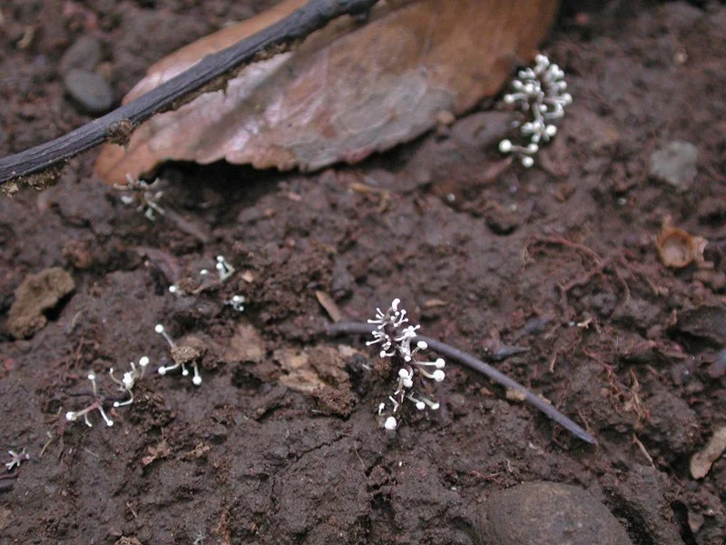The most dramatic outbreak I ever witnessed was that of Ophiocordyceps unilateralis, the so-called zombie-ant fungus. This species grows from the body of a tiny ant that has died clinging to the base of a tree. A slender black stalk 1 to 2 centimeters long emerges from the ant’s neck, and midway along the stalk appears a tiny black disc, the fungus’s fruiting body, only 1 to 2 millimeters across. Although it can be found throughout the year, it is easiest to spot in winter when the undergrowth has withered and ants are scarce.