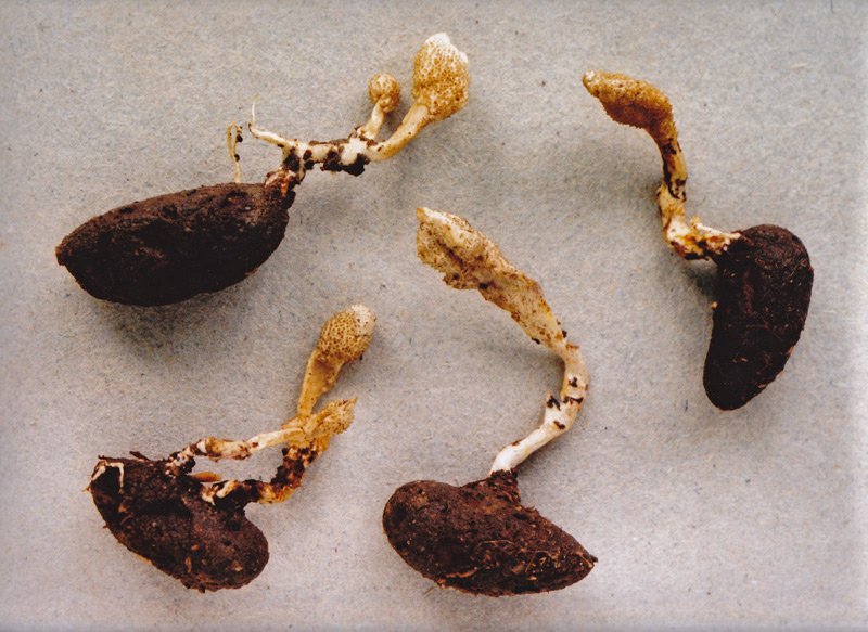 The next time I encountered the fungus was in April 2004. While walking along a hiking trail, I spotted a stark white, club-like structure growing on a slope. I dug it out and sure enough, I found that familiar cocoon. It wasn’t mature yet, and the surface hadn’t formed the tiny nodules, but there was no doubt. It was Kusanagi. I quickly reburied it, hoping to return when it was fully developed. But when I came back a week later during the Golden Week holidays, it was gone. Only a stem remained. Judging by the break, someone had snapped it off. The trail was popular so maybe a passing hiker had broken it without realizing what it was. Disheartened, I searched the area again. Luckily, I found several others. The following year, nearly ten emerged from that same slope. It looked like the area might become one of the few stable habitats of this rare fungus.