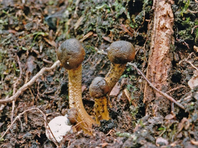 There is also the genus Gibellula, an anamorphic group of spider-parasitizing fungi considered the asexual stage of Torrubiella. Their slender club-shaped or whip-like stalks are often covered with pale violet or white powdery conidia, giving them a striking appearance.