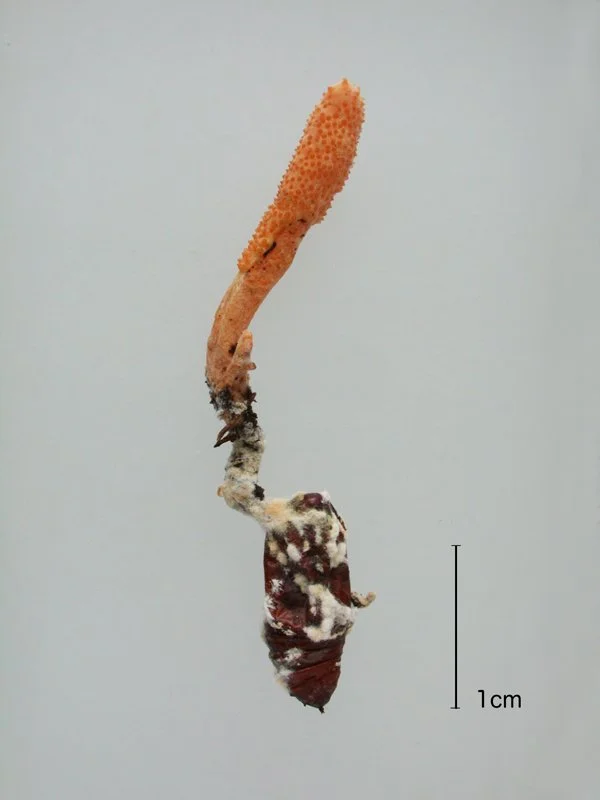 There are many Cordyceps that grow from larvae or pupae, but those that grow from adult insects, especially in their sexual (teleomorphic) stage, are quite rare. Among them, the moth-associated group known as Cordyceps tuberculata is relatively common.