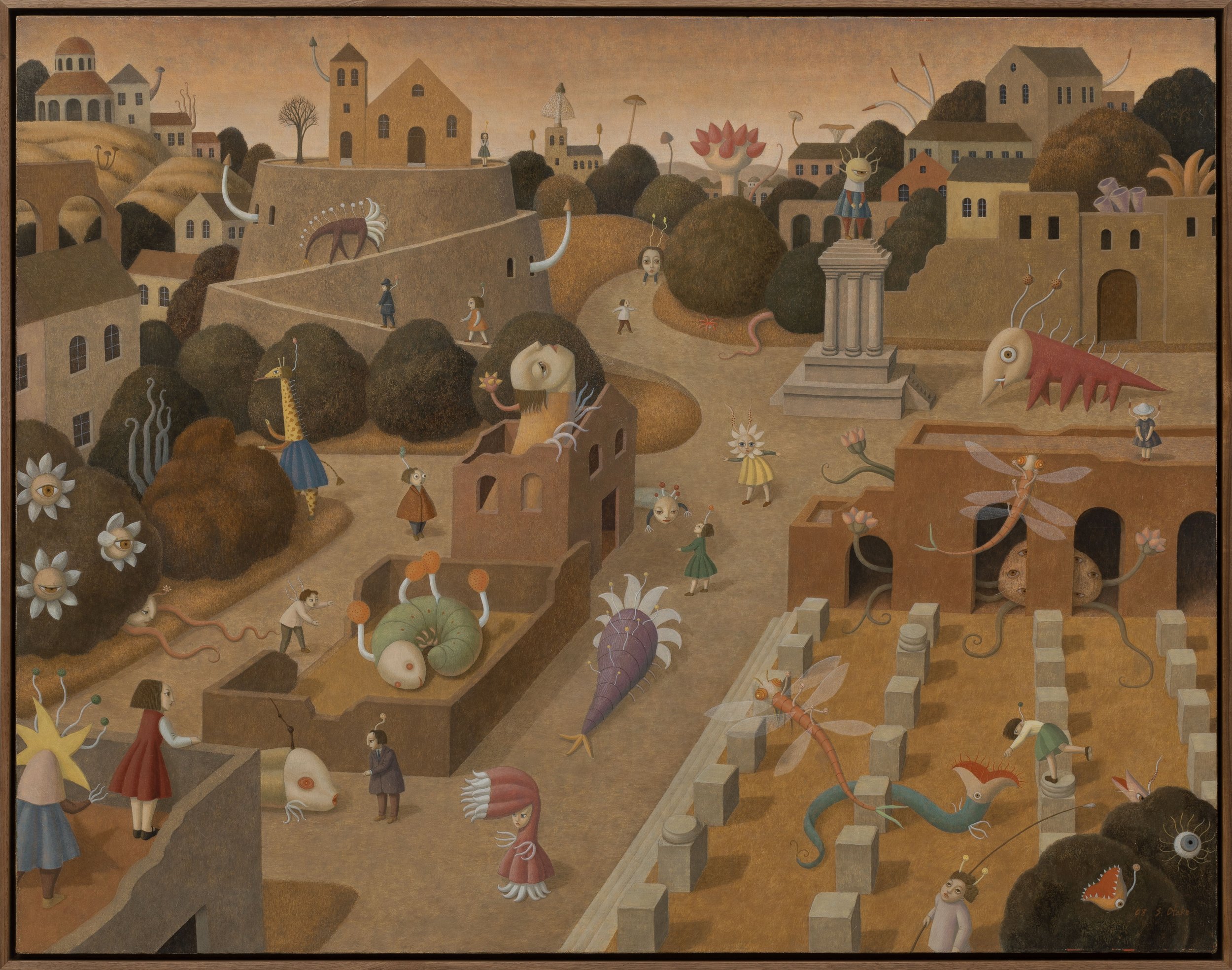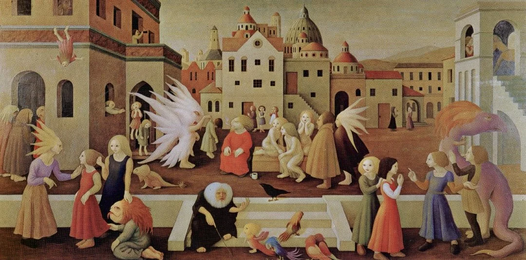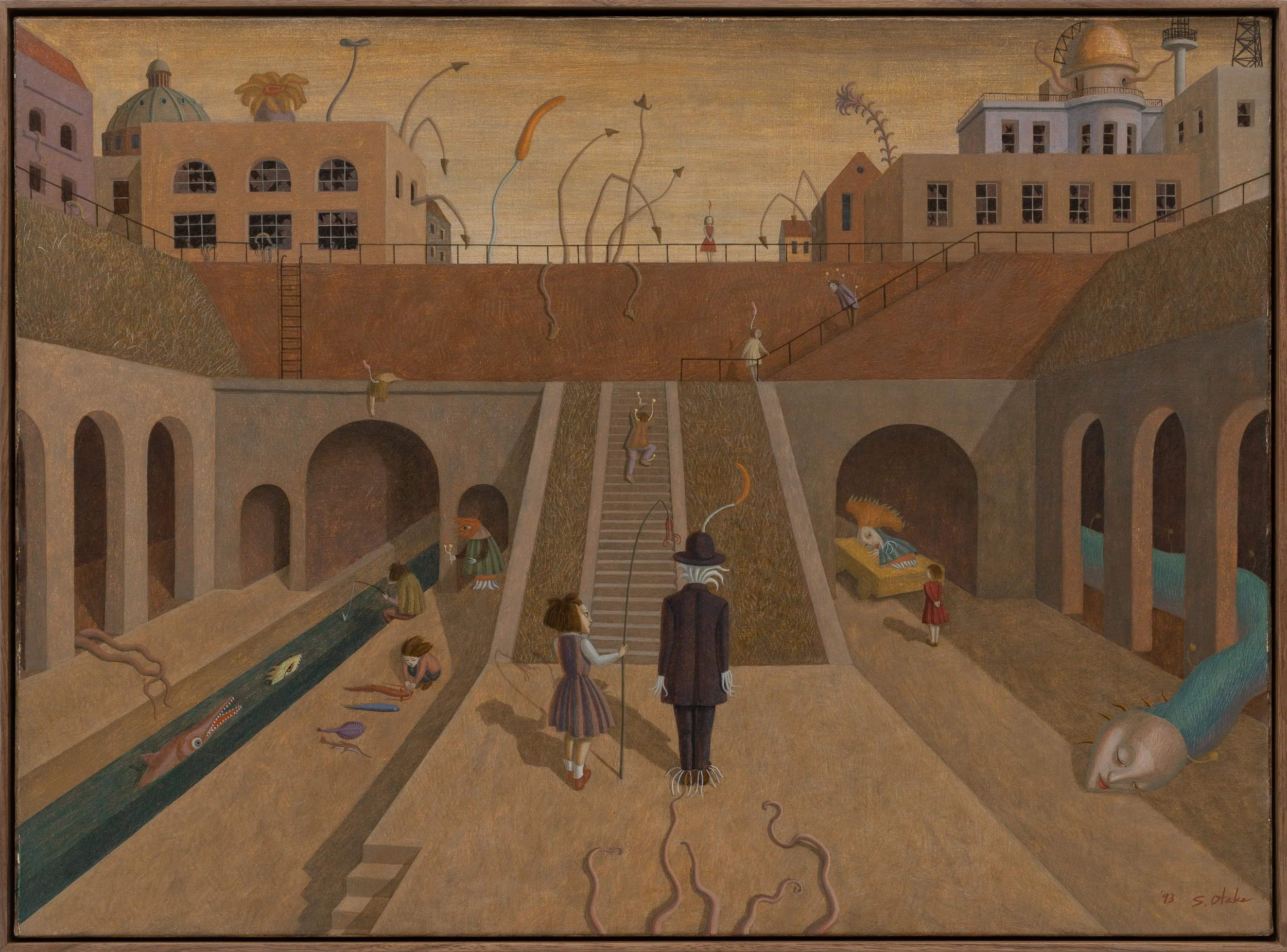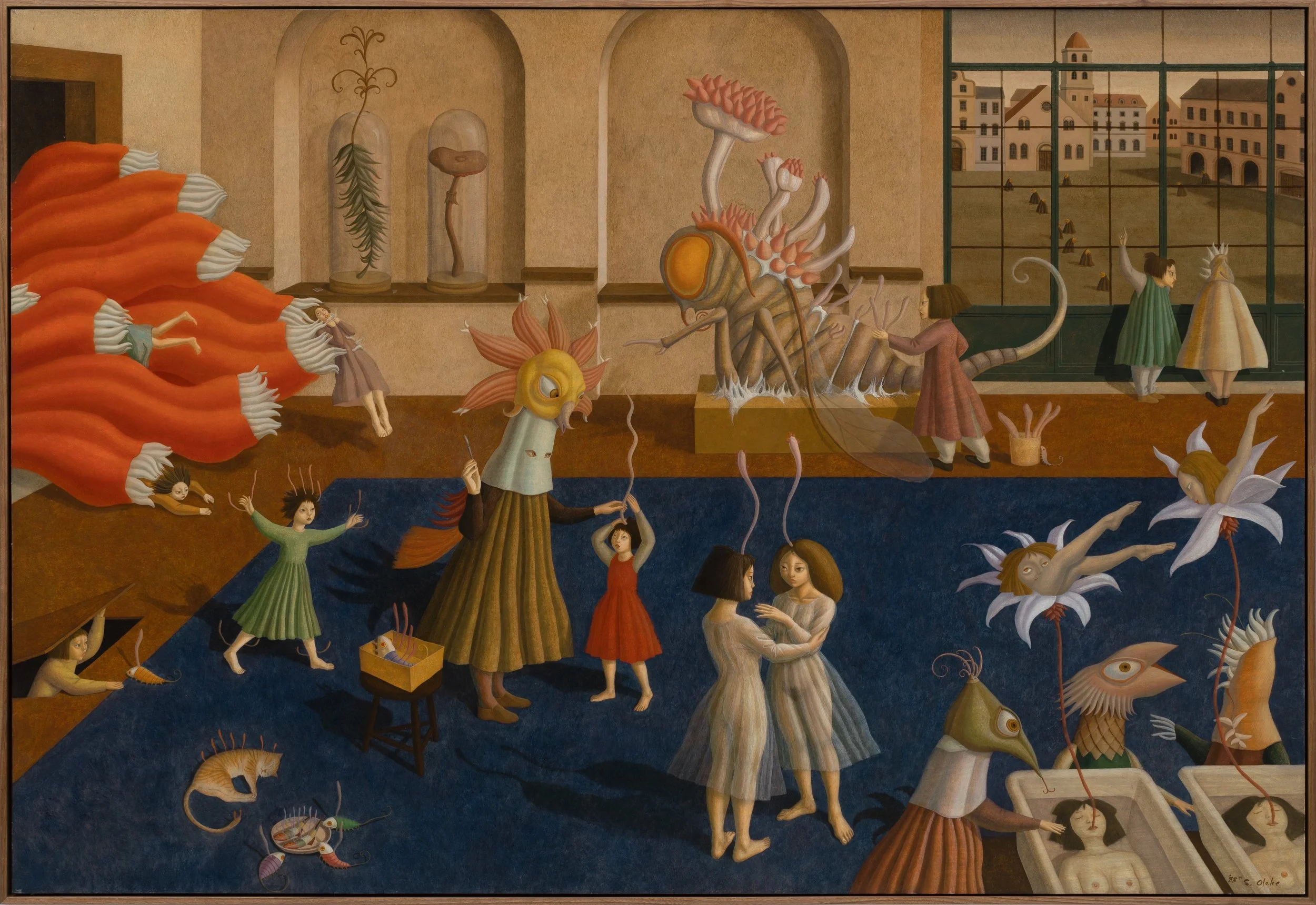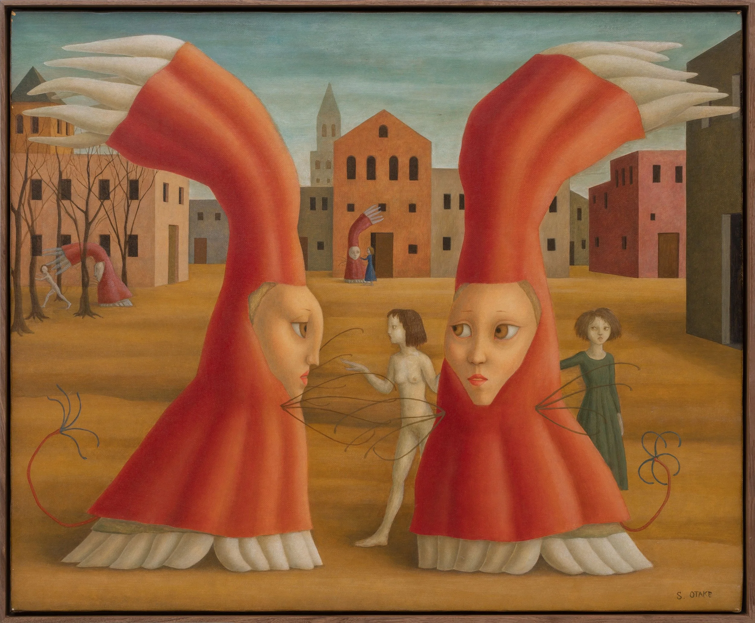 In his early works, the mutated forms of his inhabitants share similarities with the works of Leonora Carrington and Max Ernst, particularly Ernst’s Attirement of the Bride, created in 1940 under Carrington’s influence. In 1981, Otake produced a large-scale work inspired by Raphael’s School of Athens, where the species moving through a hybrid architectural landscape seem to hover between Carrington’s ethereal visions and Ernst’s mysterious characters. The “inhabitants” of Otake’s painted world dwell within recognizable medieval and Renaissance settings. This particular work brings together elements like birds preaching, the Annunciation of the Virgin Mary, the Three Graces, and Hieronymus Bosch’s chaotic depictions of the human condition in The Garden of Earthly Delights. The deeper one looks into Otake’s compositions, the more they radiate an aura of mystery, as a utopian academy of philosophers is transformed into a gathering place for wizards clad in nature’s camouflage.