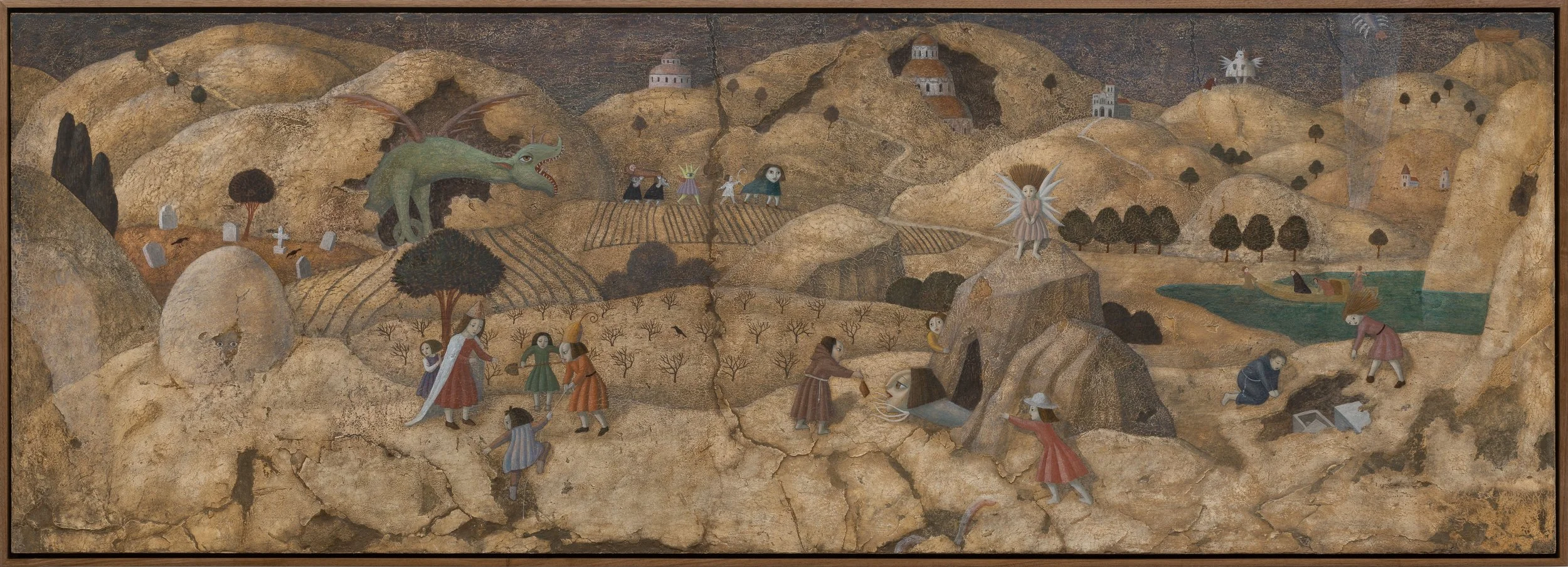 In addition to his works inspired by religious sites, Otake subtly incorporates elements from Botticelli’s flowing lines and de Chirico’s surreal, shadowy landscapes into his fantastical world. These elements quietly shape the atmosphere within his paintings. Otake’s exploration of technique also continues. His 1996 work Heritage reflects a thoughtful meditation on Western methods and styles. What makes this piece particularly special is Otake’s use of a fresco transfer technique. Since frescoes are painted directly onto walls, moving them requires peeling the surface layer of the wall and transferring it onto a new material. Typically, an adhesive is applied to the surface, and once the fresco is removed, it is transferred to a new base, and the adhesive is then dissolved. In Heritage, Otake depicts an ancient ruin that has now become a playground for children on a treasure hunt. This structure of looking back at the past is echoed in Otake’s later works, where humanity looks at present-day ruins from a future perspective.