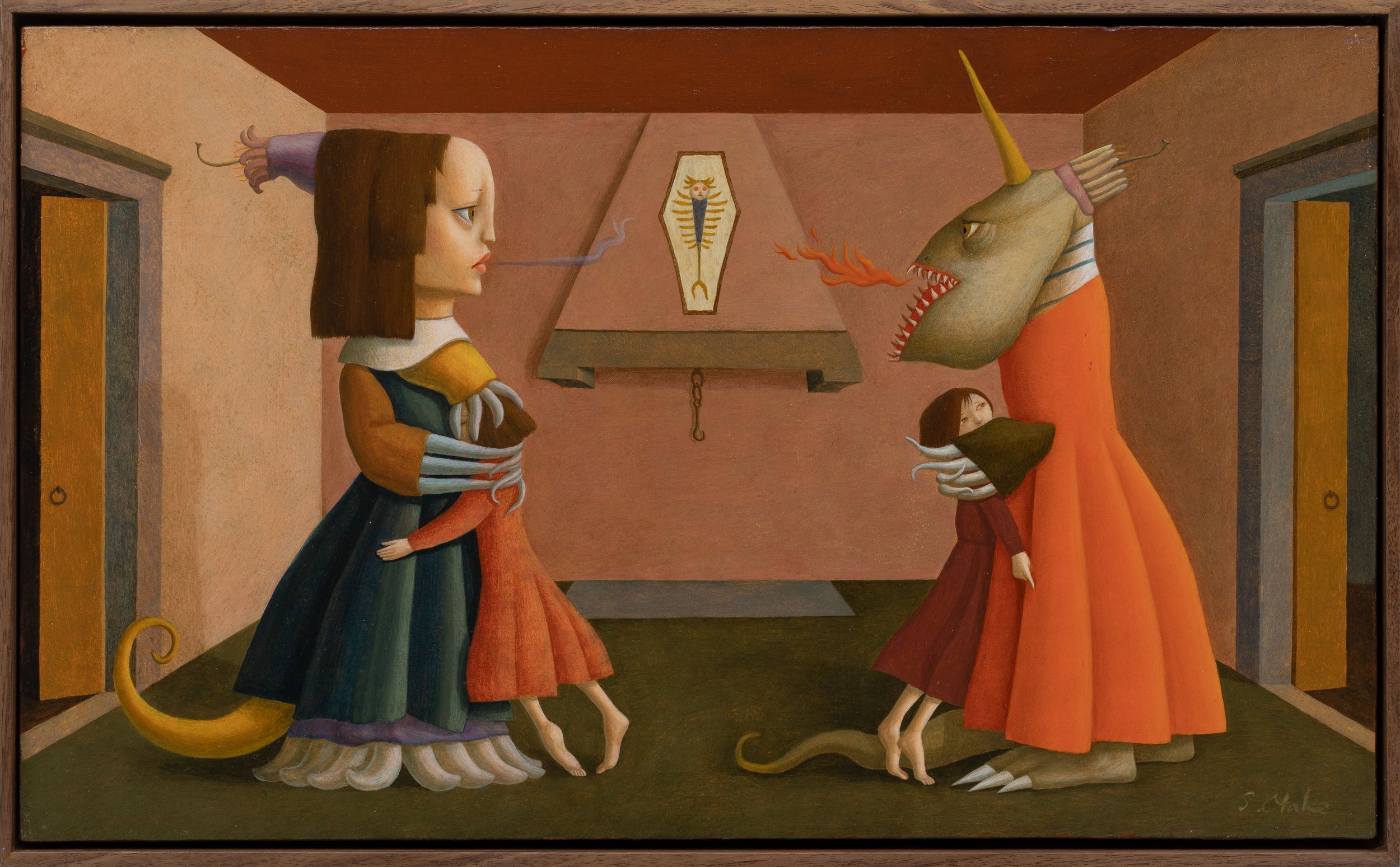 Exploring Shigeo Otake’s works from the 1980s through the next twenty years is like stepping into a visual jungle shaped by figures like Paolo Uccello, Giotto di Bondone, Sandro Botticelli, and Giorgio de Chirico. For Otake, the emphasis on symbolism in European medieval and early Renaissance art reflects a shared intellectual rigor: the blending of narrative, the exploration of technique, and the focus on metaphysical meaning. This seemingly rigid style, however, becomes the perfect framework for capturing the essence of Japan’s yokai (spirit) culture. From the very beginning, Otake appeared to consciously adopt the higher-level metaphors and symbolic expressions offered by Western styles as a means of building his otherworldly kingdoms. In other words, the masterpieces of Western art became the ideal habitat for the strange inhabitants of Otake’s worlds.