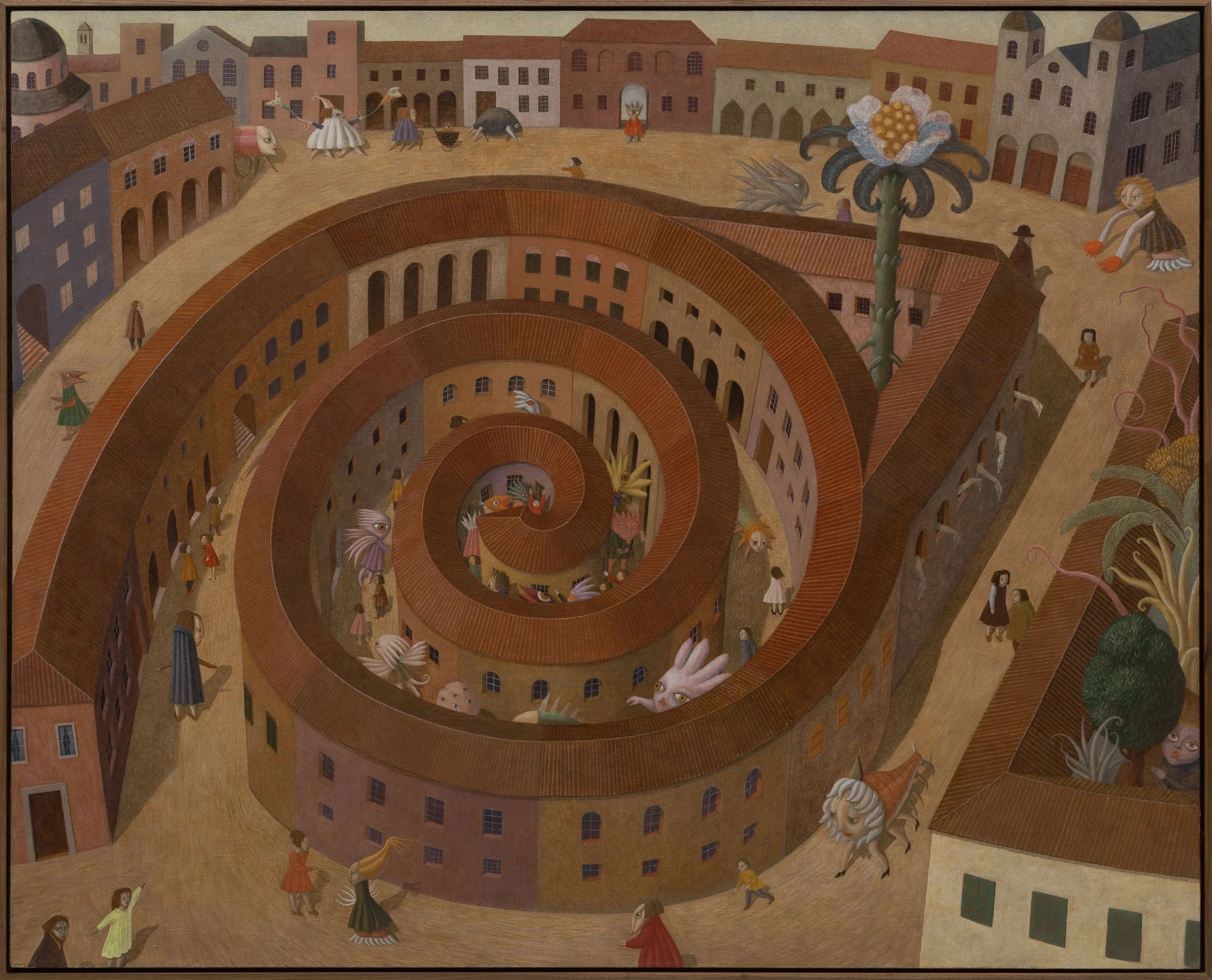 From cities shaped by optimistic visions to reflections and rebuilding among collapsed fortresses, ruins for Otake ceased to signify the end of physical space and instead became entry points into a ruinous state of consciousness. The personal trauma of the Hanshin earthquake gradually evolved into a pointed critique of the logic of modernity. Also painted in 1995, Blind Alley pushes the semantics of ruin into the philosophical realm. Inspired by a circular plaza in Lucca, Italy, the artist deliberately transformed its open structure into a closed spiral. The spiral, often a symbol of life’s cycles, return, and introspection, resonates with Otake’s continued interest in the hard and ancient shells of marine creatures. However, the title Blind Alley negates the symbolic optimism of the spiral, suggesting instead rupture, stagnation, even a sense of dead end. This stands in striking contrast to his 1992 monumental fourteen-meter mural Transformation of the City, which unfolds like an earthly paradise. That work evokes the imagery of Venetian canals and reveals the artist’s ambition to construct a Bosch-like grand narrative. Blind Alley, as a post-earthquake self-denial, encloses its pictorial space yet radiates a claustrophobic pressure from within. It becomes an image not only of blocked spiritual pathways but also the breakdown of linear perception itself.
